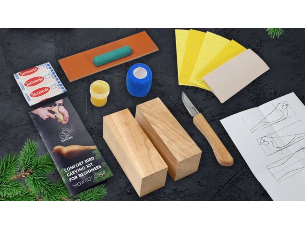 DIY01 Řezbářská sada pro záčátečníky Comfort bird, obsahuje nůž na vyřezávání, pomůcky na broušení, 3 brusné papíry různé zrnitosti, návod na výrobu figurky ptáčka, dřevo z lípy a třešně na vyřezávání.