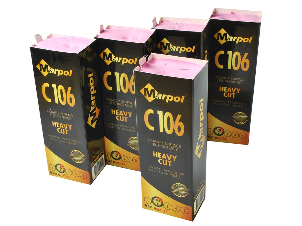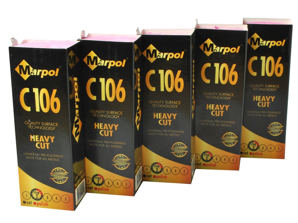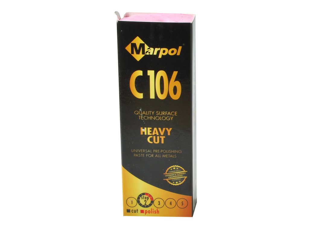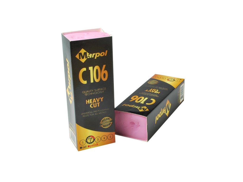 MARPOL C106 - highly abrasive pre-polishing paste (grade 2) with very high cutting power for fast surface unification and medium gloss. Suitable for stainless steel, steel, brass, aluminum, its alloys and other non-ferrous metals. Ideal for first polishing with sisal or denim.