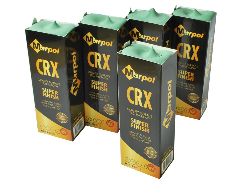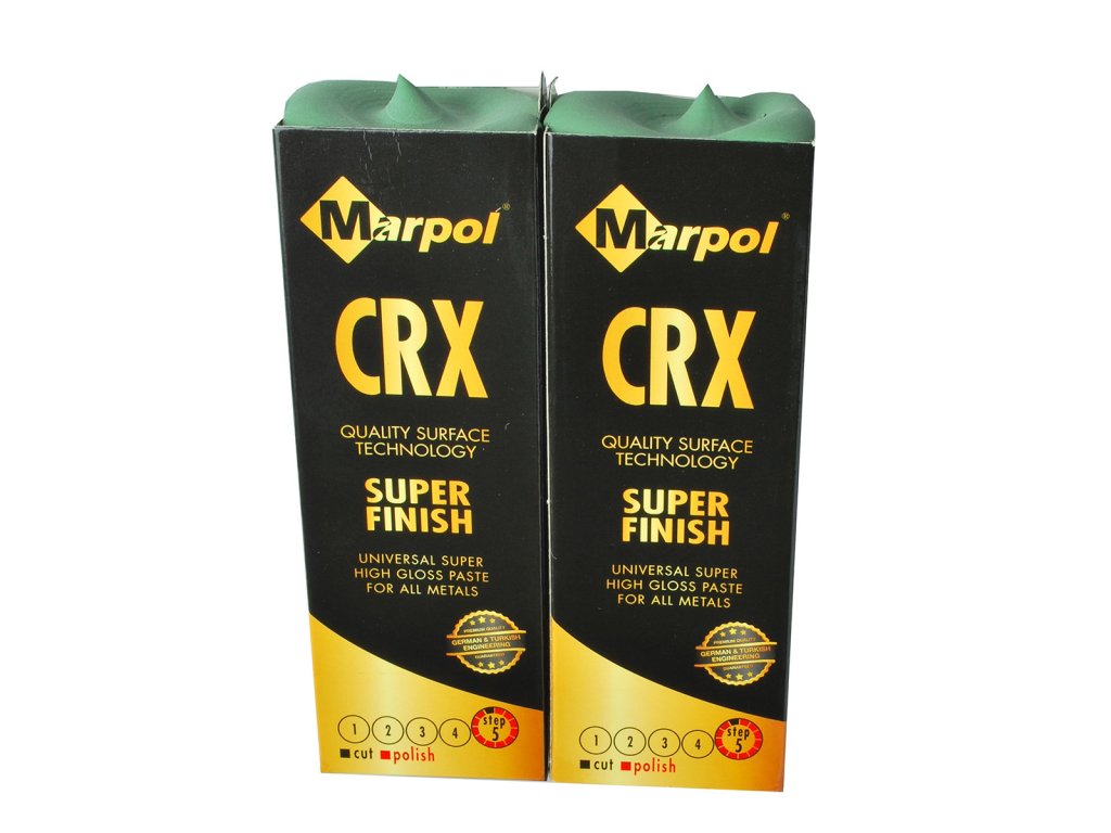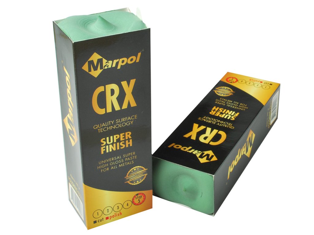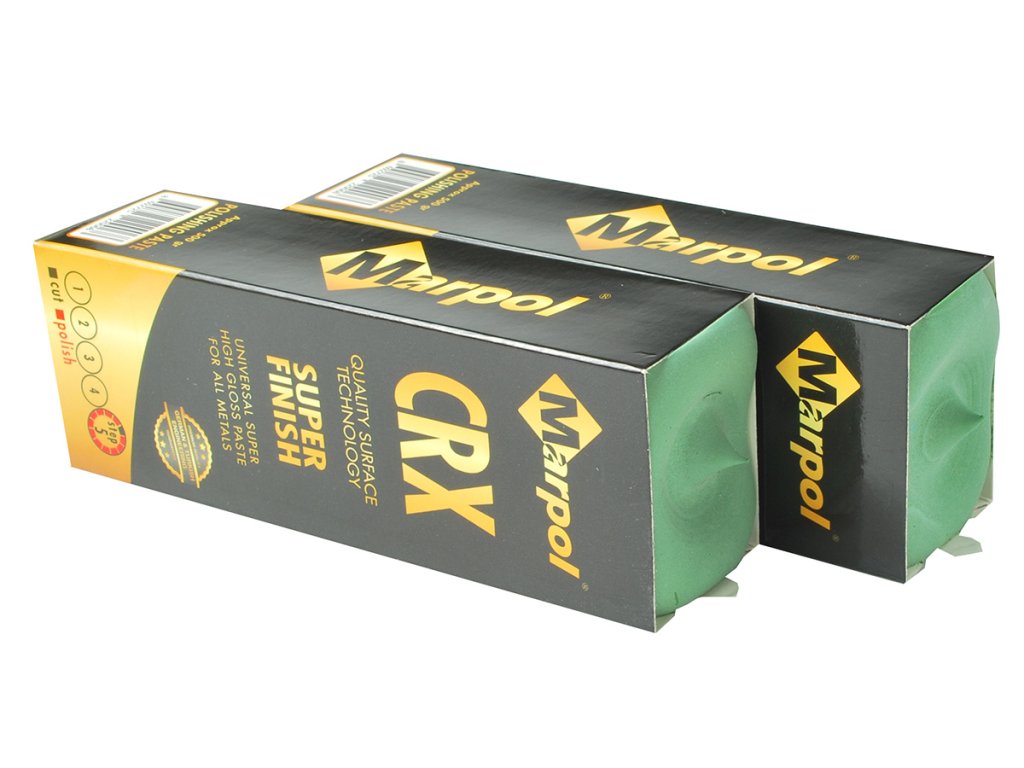 MARPOL CRX – final polishing paste (grade 5) for a mirror finish. Suitable for steel, stainless steel, and non-ferrous metals. Used with cotton and flannel wheel.