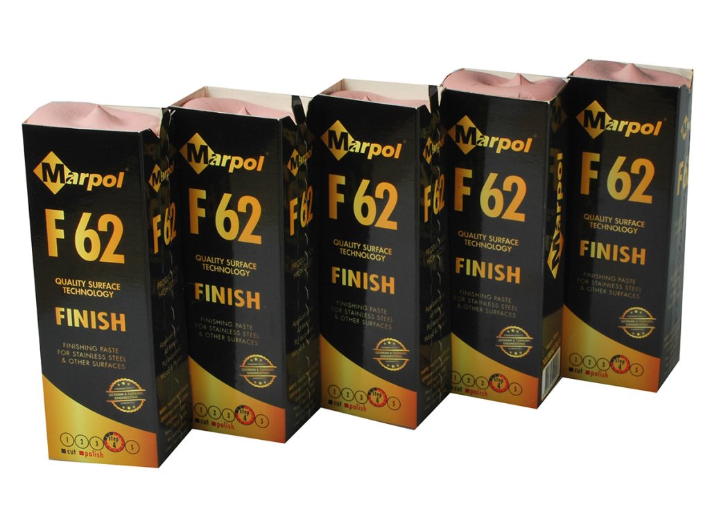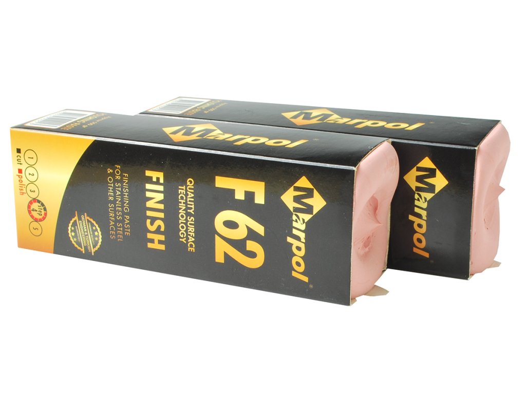 MARPOL F62 – universal polishing paste (grade 4) for high gloss. Suitable for stainless steel, steel, non-ferrous metals, wood, carbon fiber, acrylics, resins and plastics. Used with cotton and flannel wheel.