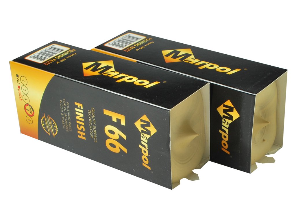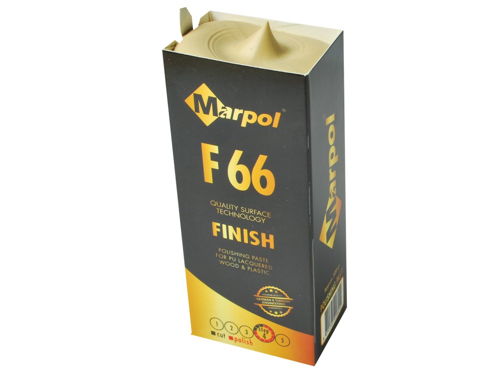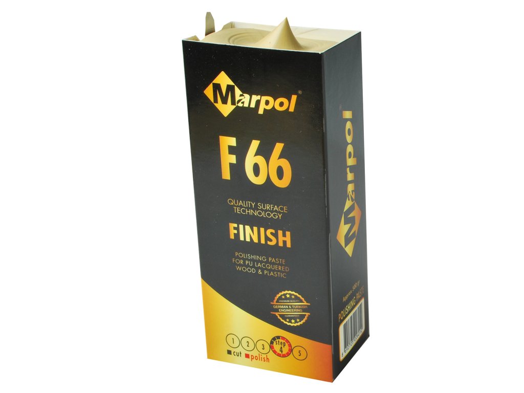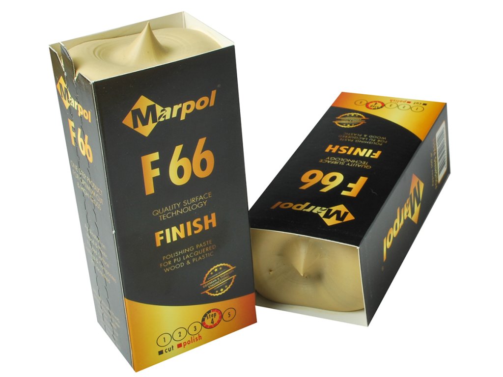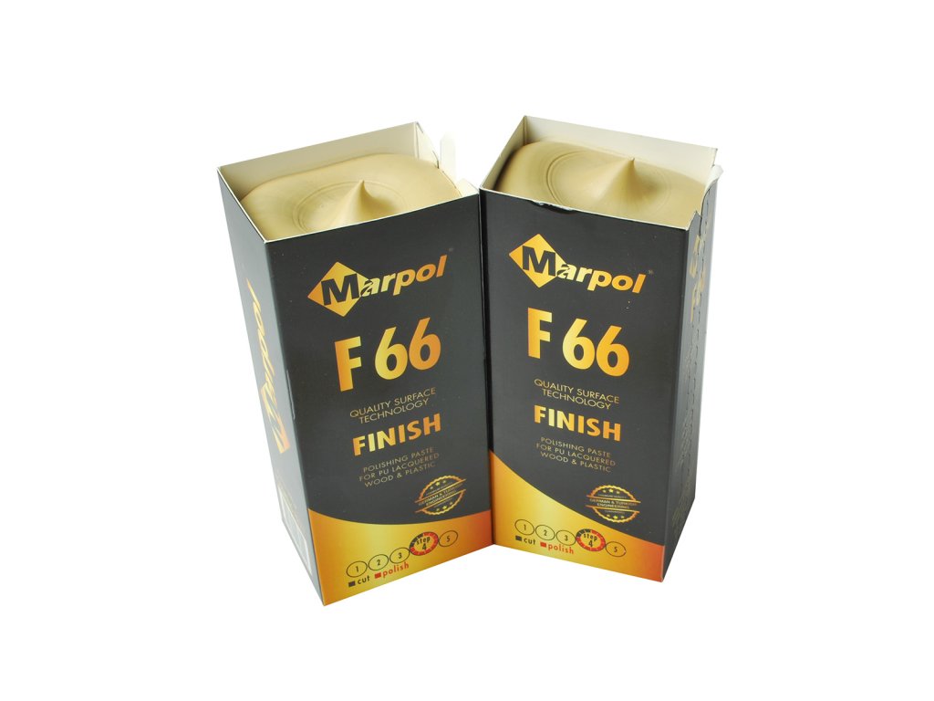 MARPOL F66 – finální leštící pasta (stupeň 4) pro vysoký lesk na měkkých materiálech jako je dřevo, plasty, polyuretanové laky, epoxidové pryskyřice a akryláty. Používá se s bavlněnými a flanelovými kotouči.