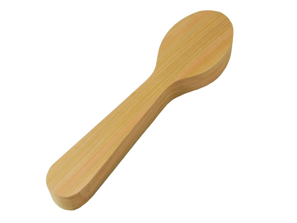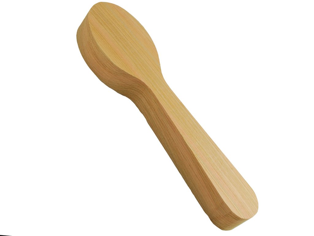 Polotovar pro výrobu dřevěné lžíce pomocí řezbářských nožů a dlát. Tvar a rozměry jsou navrženy tak, aby umožnily snadné vyřezávání dřevěné lžíce bez nutnosti hrubého opracování materiálu.