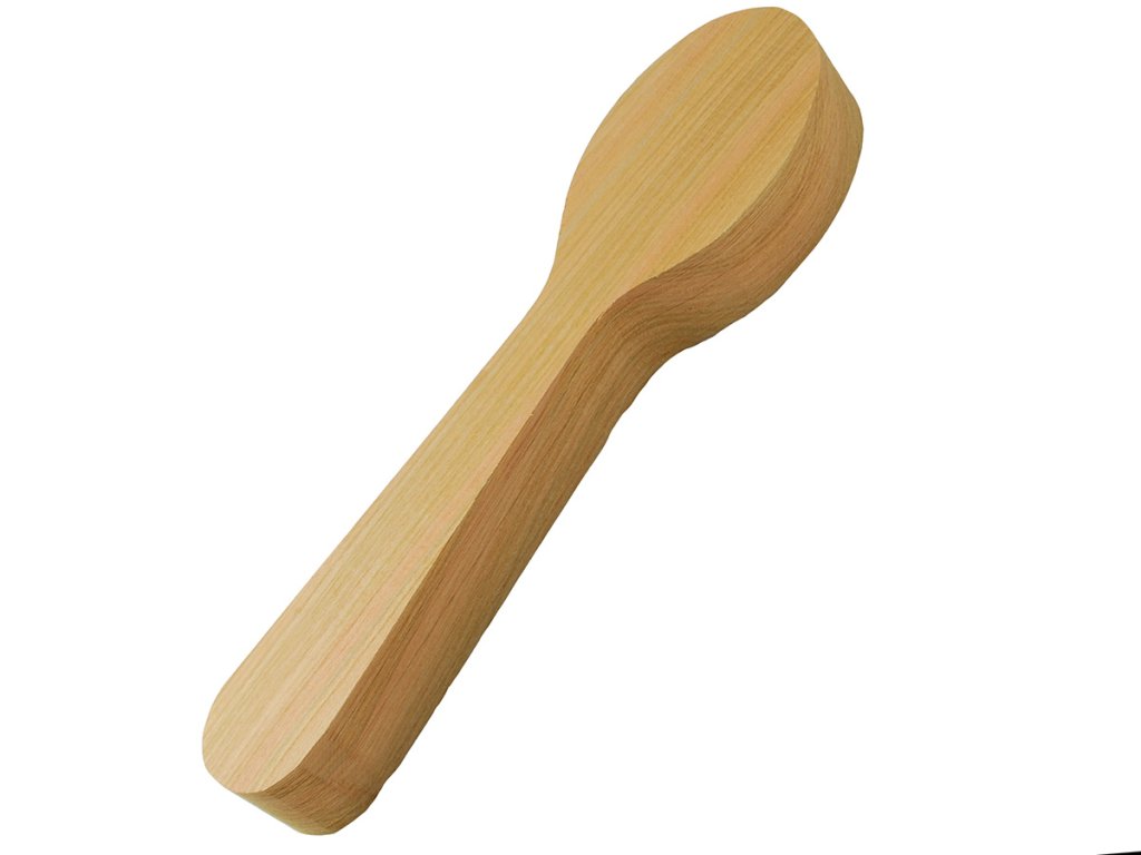 Polotovar pro výrobu dřevěné lžíce pomocí řezbářských nožů a dlát. Tvar a rozměry jsou navrženy tak, aby umožnily snadné vyřezávání dřevěné lžíce bez nutnosti hrubého opracování materiálu.