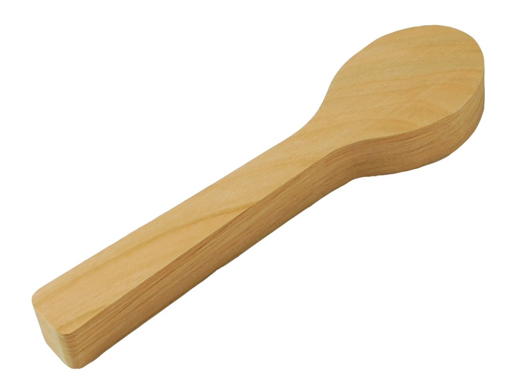 Polotovar pro výrobu dřevěné lžíce pomocí řezbářských nožů a dlát. Tvar a rozměry jsou navrženy tak, aby umožnily snadné vyřezávání dřevěné lžíce bez nutnosti hrubého opracování materiálu.
