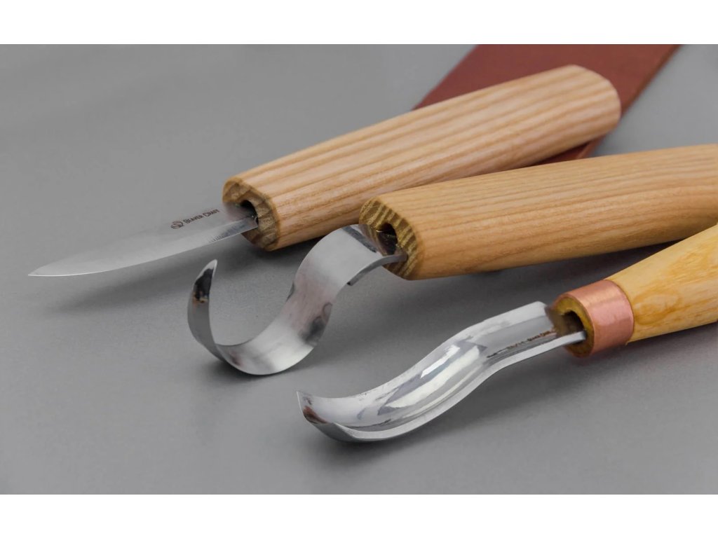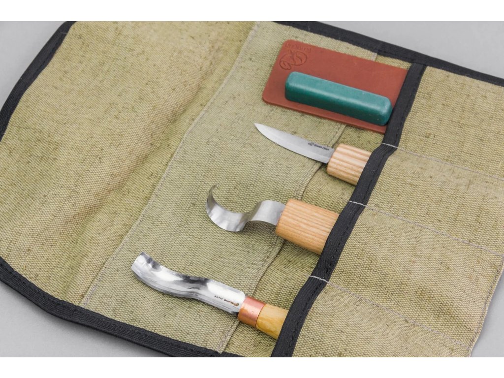 S38 základní vyřezávací sada pro začátečníky i pokročilé pro hloubení a vyřezávání lžiček. Obsahuje řezbářský nůž SK1, lžičkový nůž C1 a prohnuté řezbářské dláto K8a/14, obtahovací kůže a pasta LS2P1.